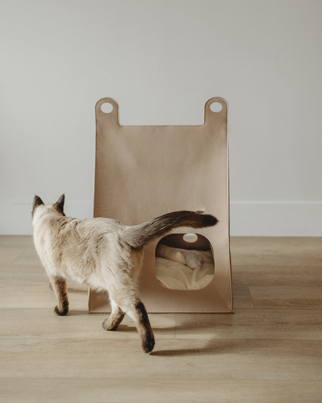 Une maison minimaliste où votre chat peut jouer et se détendre. Cette maison a été conçu spécifiquement pour répondre à l'amour de votre chat pour les petits espaces. Elle est fabriquée en feutre à 100 % d'une riche couleur moka. Sa propre petite maison dans votre grande maison.