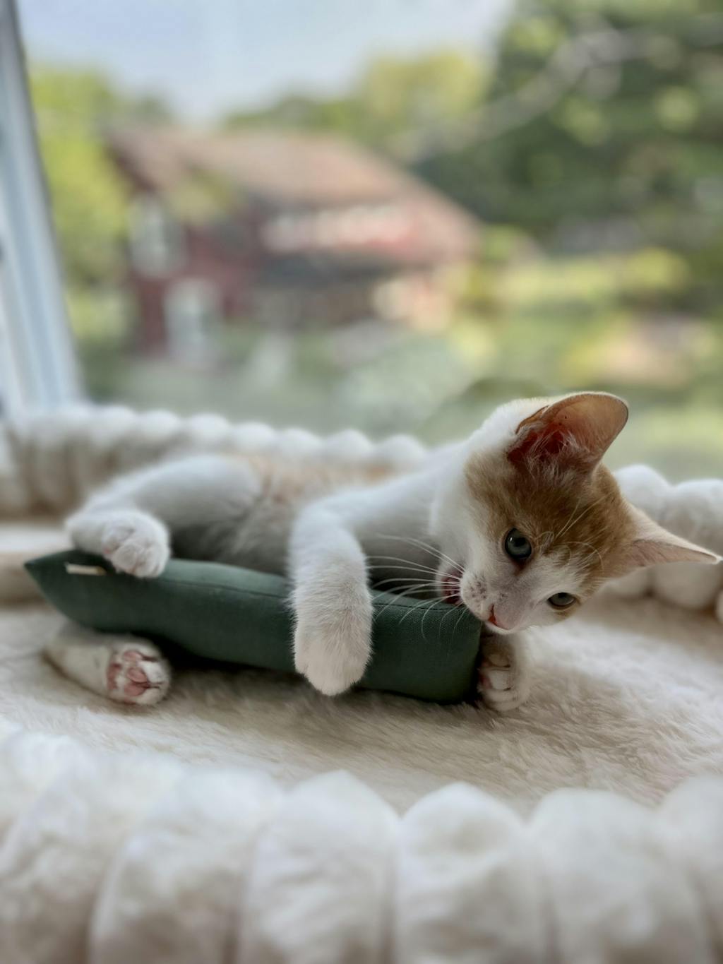 Mon chat l'aime beaucoup ce fut un coup de foudre pour lui. J'ai du renforcer une couture tellement il le mordiller. La montagne enneigée a maintenant un pic vert. Merci